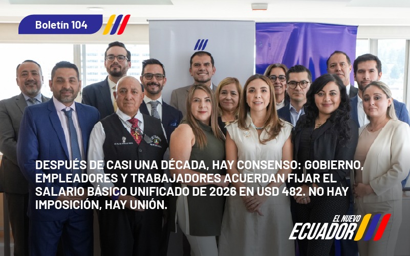 La mañana de este lunes, 15 de diciembre, el Gobierno Nacional, a través del Ministerio del Trabajo, informa que, tras un proceso de diálogo técnico y constructivo entre representantes del Gobierno, empleadores y trabajadores, se alcanzó un consenso histórico para la fijación del Salario Básico Unificado (SBU) del año 2026, que se establecerá en USD 482, con un incremento de USD 12.