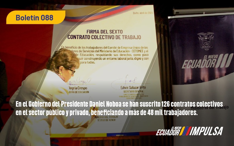 El Nuevo Ecuador impulsa los derechos de los trabajadores. En el Gobierno del Presidente Daniel Noboa Azin, desde noviembre de 2023, en articulación con el Ministerio del Trabajo, se han suscrito 126 contratos colectivos, en el sector público y privado, en beneficio de 48.710 trabajadores a escala nacional.